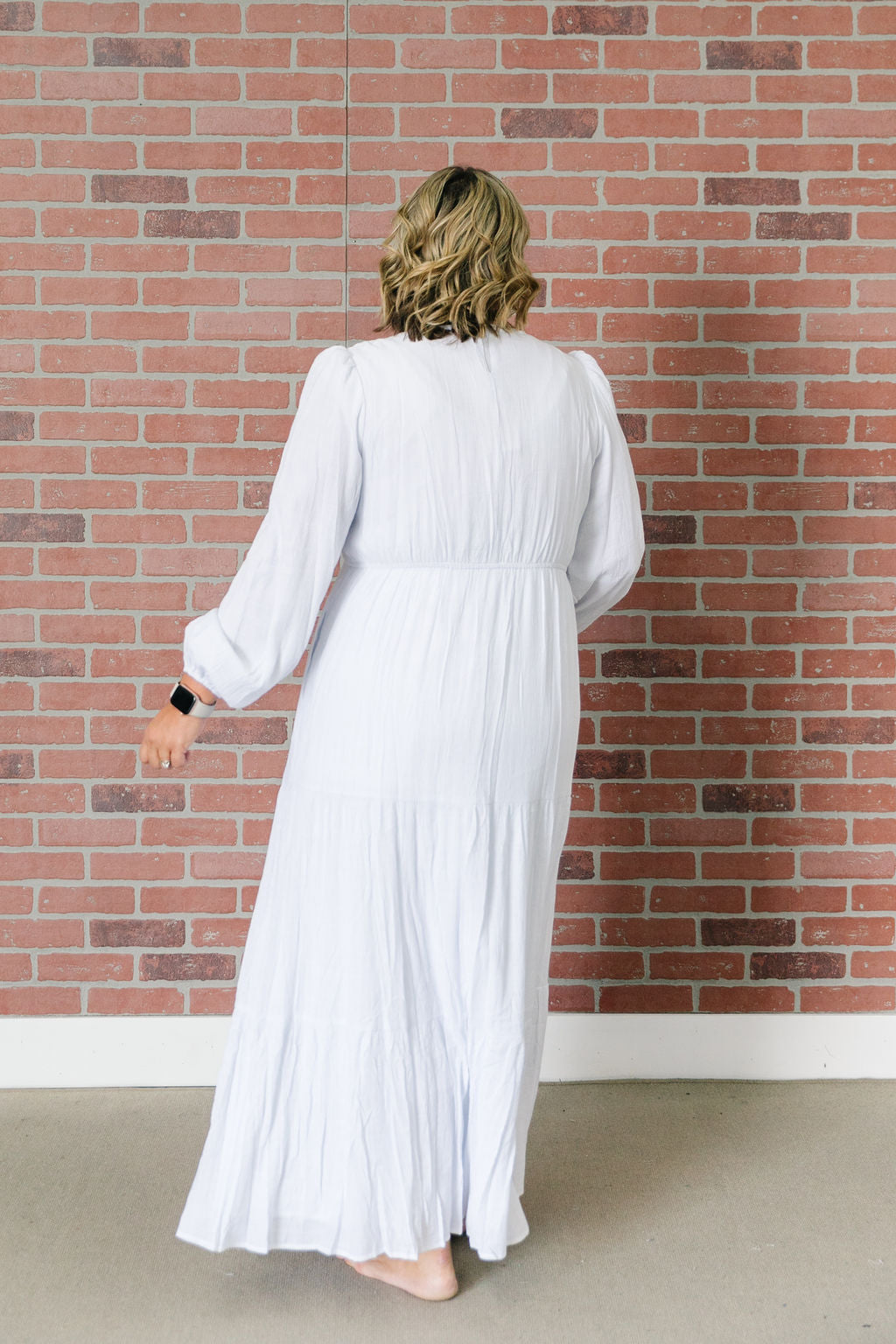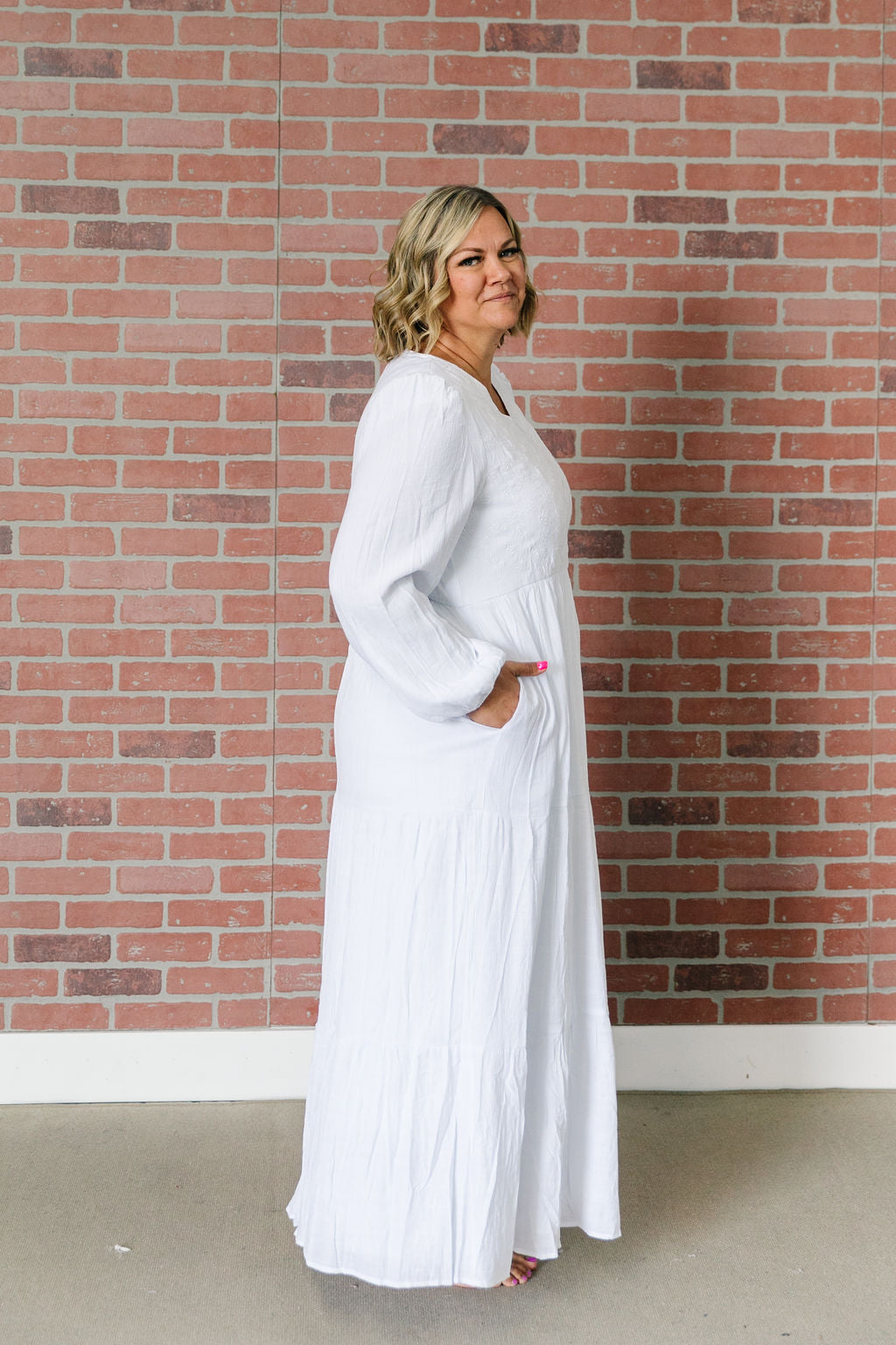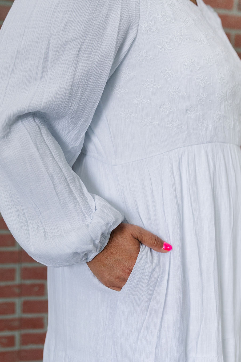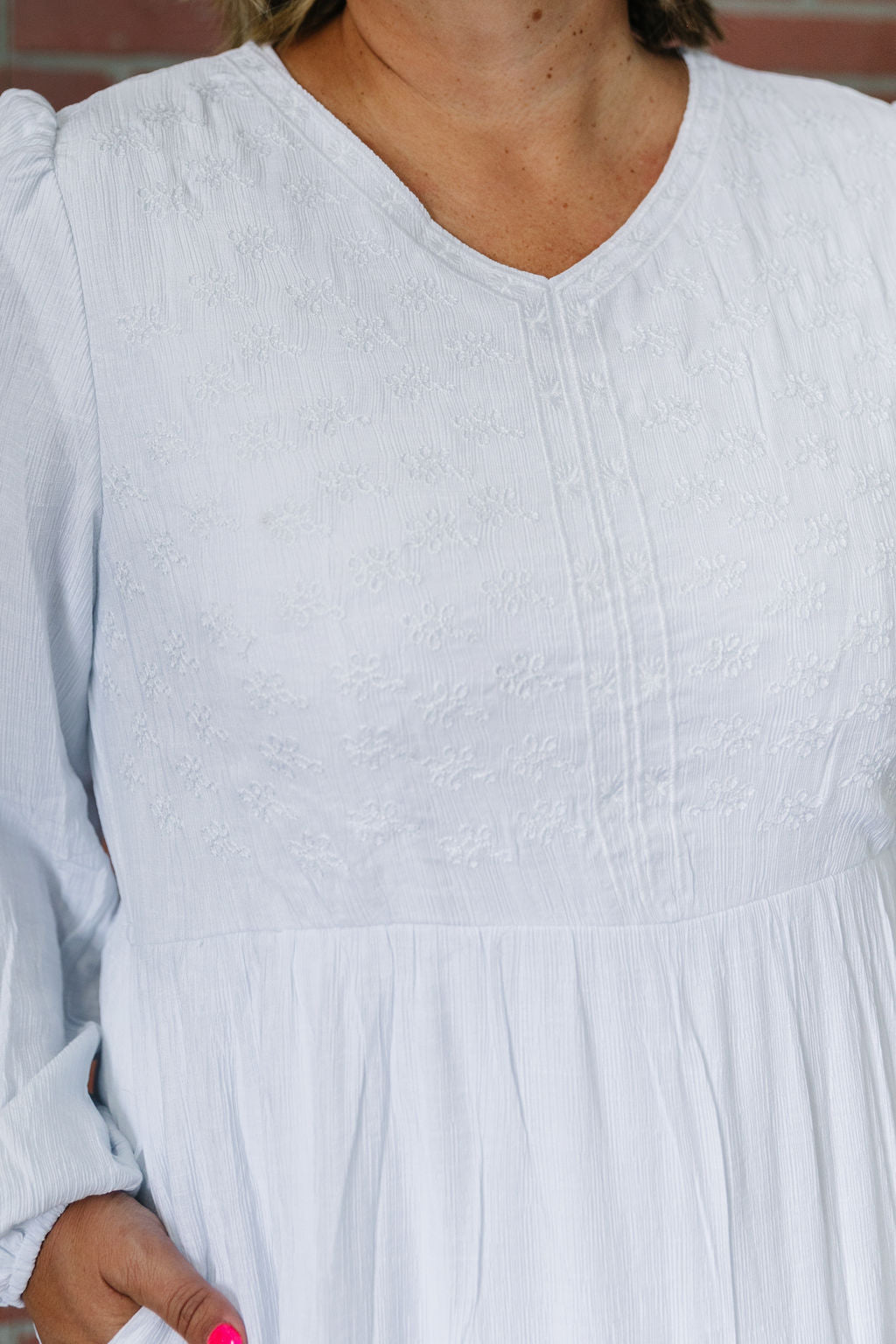 Brighten your wardrobe with this charming white dress, featuring playful embroidered florals on the bodice and a modest V-neck that adds a touch of fun. Long sleeves with elastic cuffs and a cinched waist create a comfortable, flattering fit, while the tiered skirt adds movement and flair. Fully lined and equipped with handy pockets, this dress combines whimsy with practicality for your special occasion.