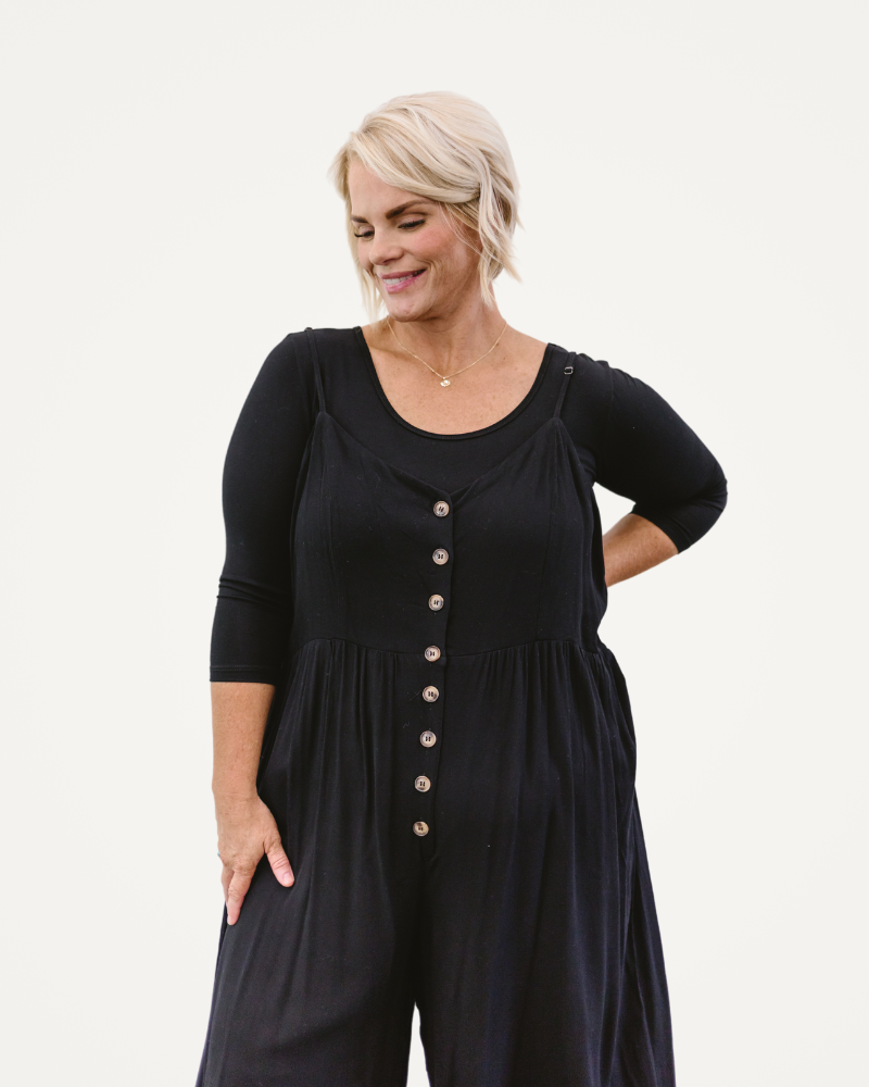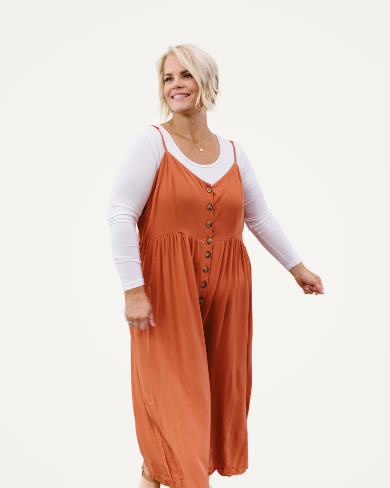 Get ready for fall with our Button Down Rayon Crepe Jumpsuit! This stylish and comfortable one-piece features a button down design made from soft, flowing rayon crepe fabric. Perfect for a casual day out or dressed up for a night on the town.