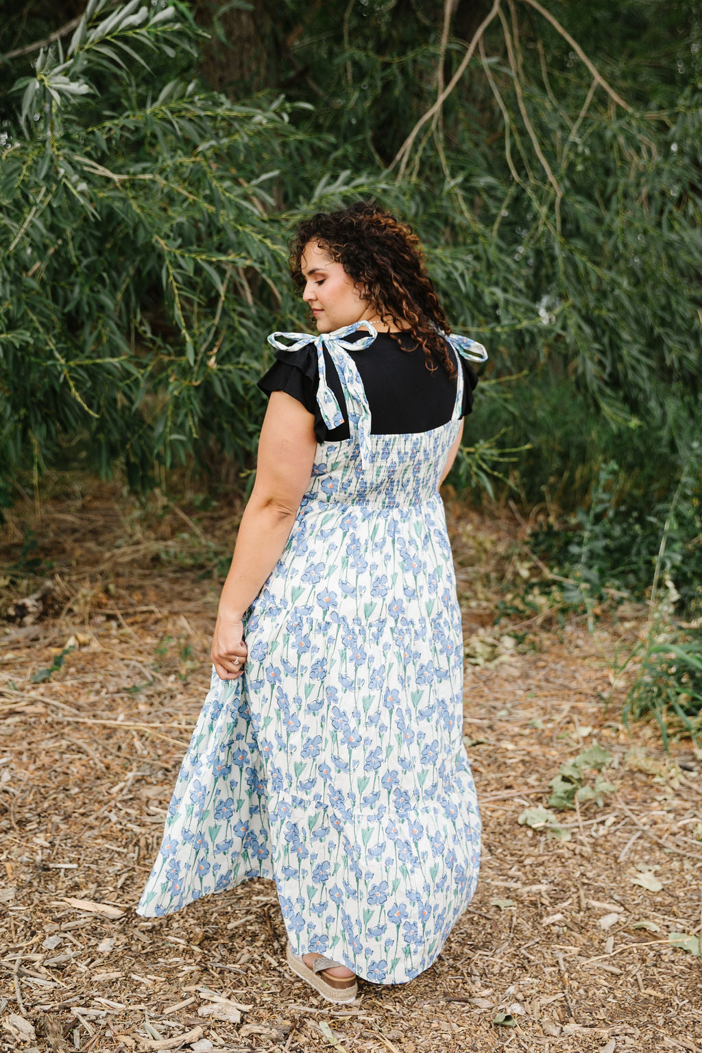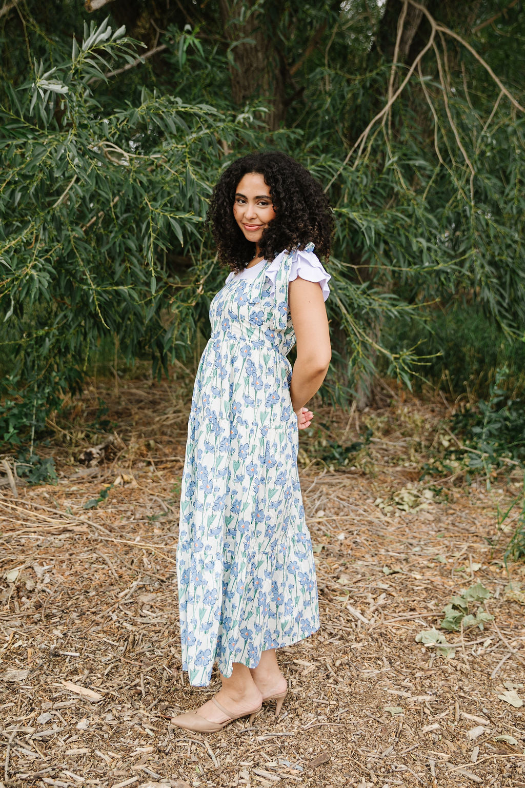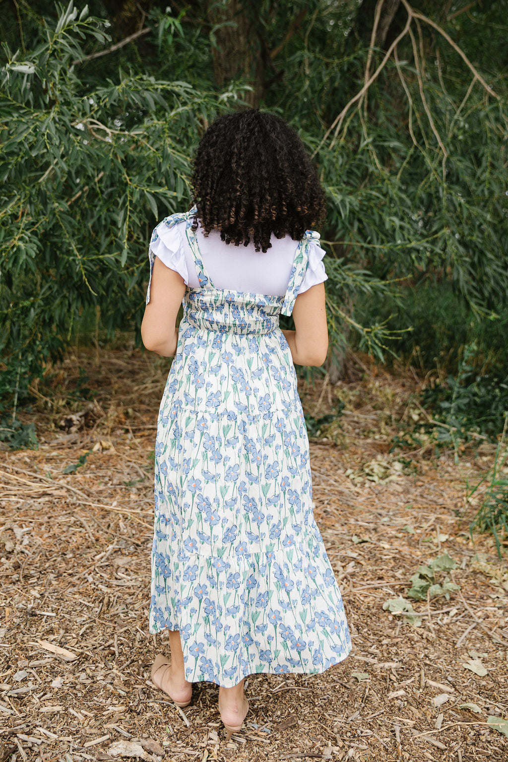 This playful Ellie Maxi Jumper features a fresh white base adorned with charming blue florals. Adjustable tie straps let you find the perfect fit, while the smocked back adds comfy stretch. Fully lined and tiered for a flowing silhouette, it’s a breezy choice for sunny days and casual outings.