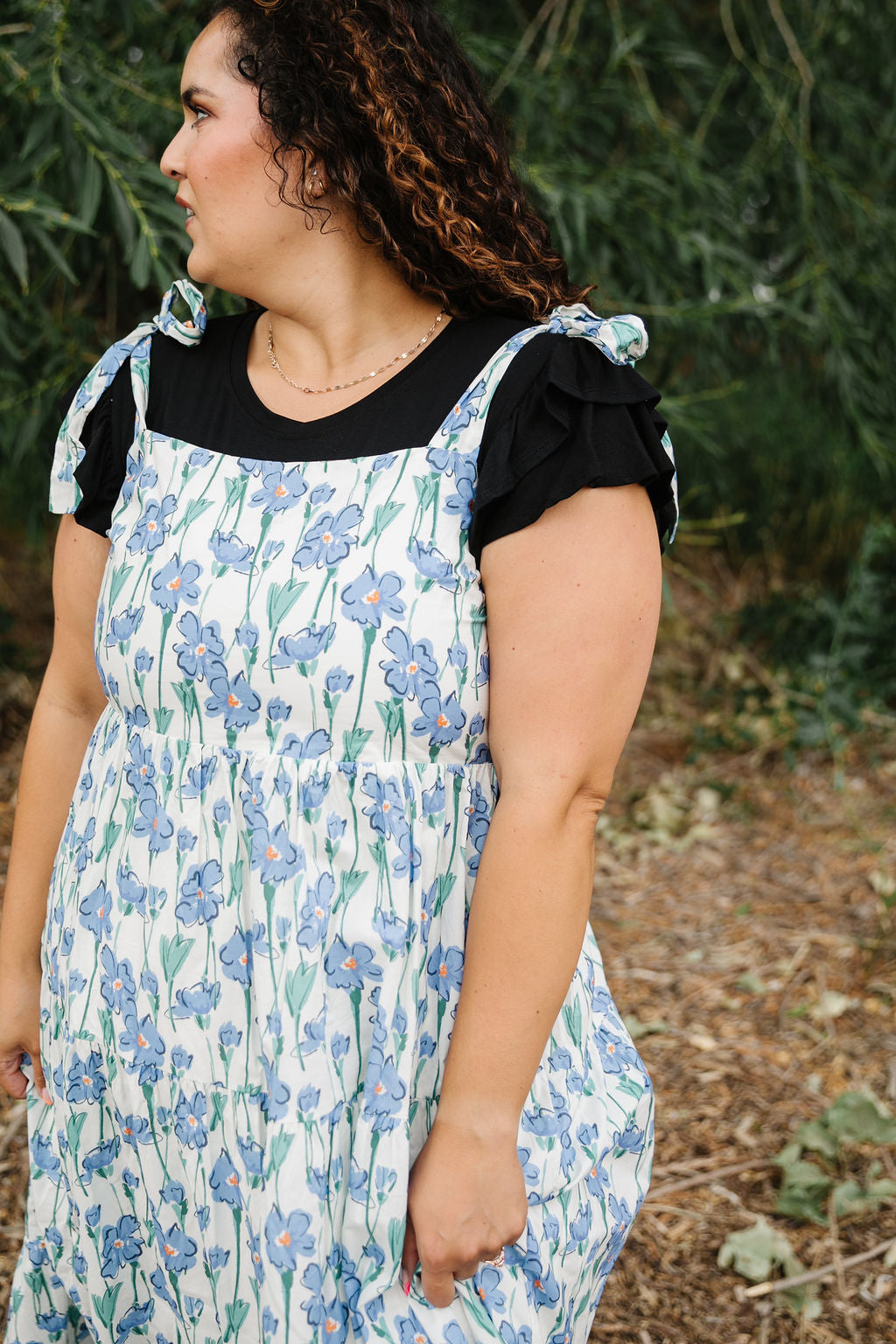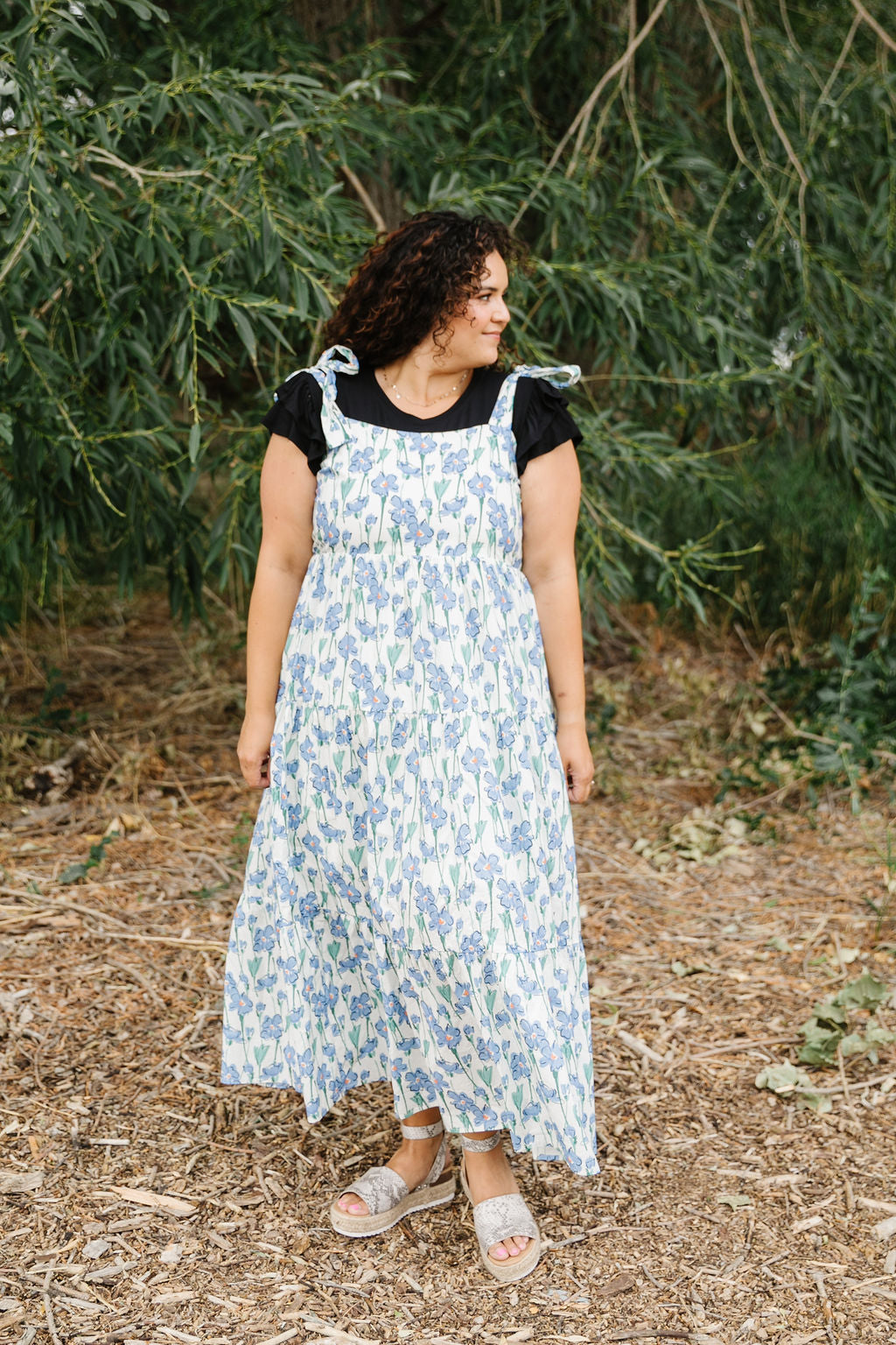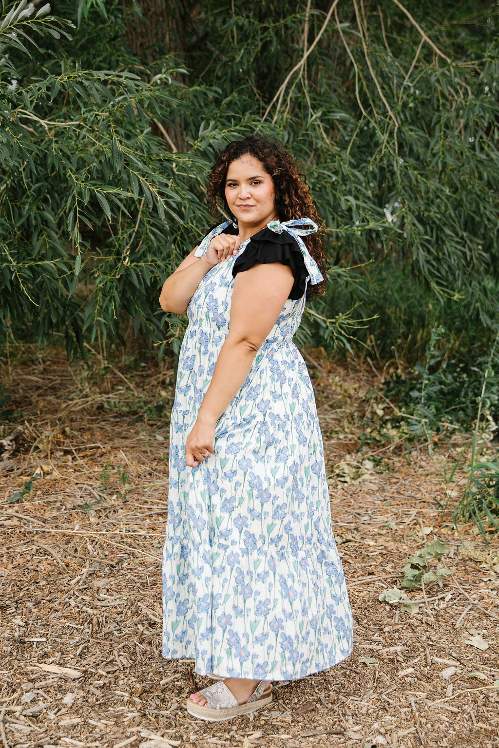 This playful Ellie Maxi Jumper features a fresh white base adorned with charming blue florals. Adjustable tie straps let you find the perfect fit, while the smocked back adds comfy stretch. Fully lined and tiered for a flowing silhouette, it’s a breezy choice for sunny days and casual outings.